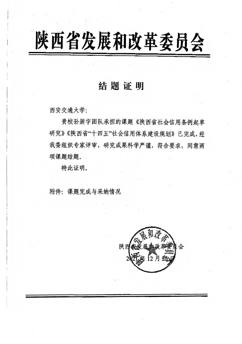 《陕西省社会信用条例起草研究》《陕西省“十四五”社会信用体系建设规划》结题证明